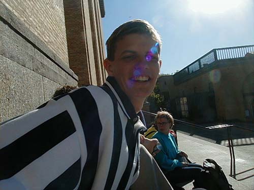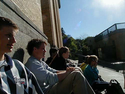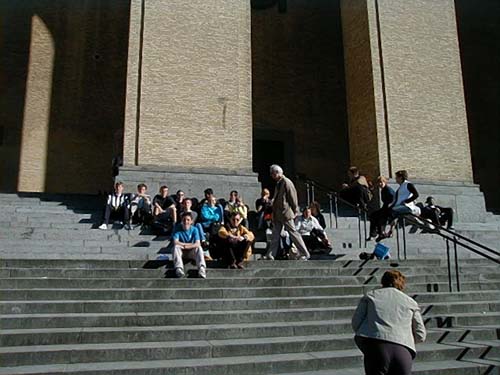 Sitting on a stair outside an artmuseum, enjoying life.